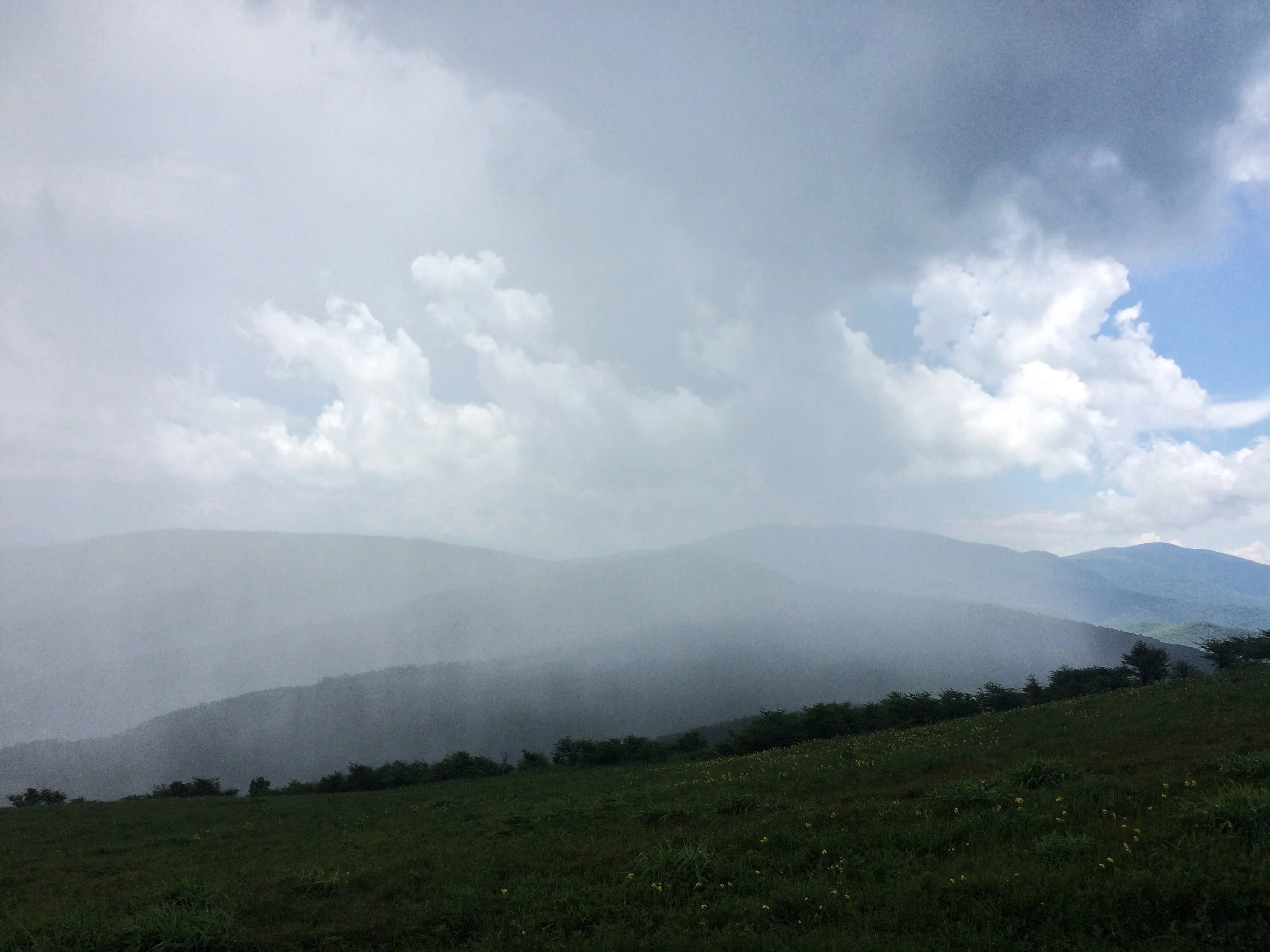 This time, I ran into Lost and Found at Carvers Gap. (We've been hiking together ever since.) We sat on the summit of Hump, talking about our journey thus far and watching storms build in the distance. Suddenly it began to rain a short distance away. The views from Hump are so expansive and it was absolutely incredible to see the rain rushing over the mountain. Right toward us! Or so we thought. The rain just missed us and we stayed dry somehow, yet again. The wind carried bitter clouds away and reintroduced Carolina blue skies.